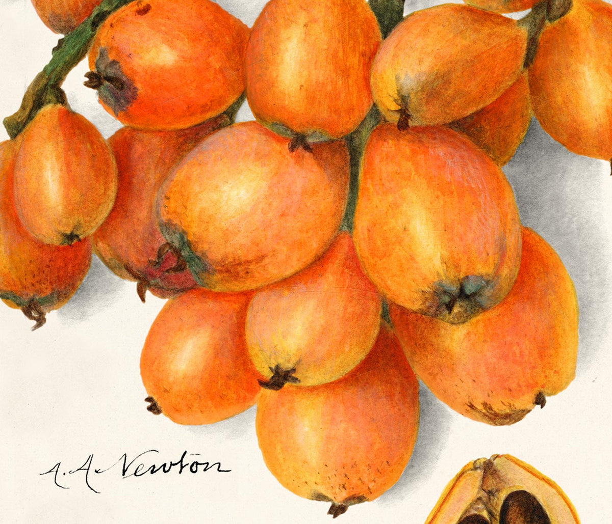Amanda Almira Newton · 1908 · Luminosa impressão botânica de nêsperas com frutos laranja e fundo branco nítido
