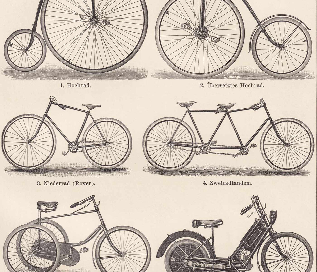 Meyers Konversations Lexikon · 1894 · Impressão vintage detalhada de bicicletas com traço preto nítido
