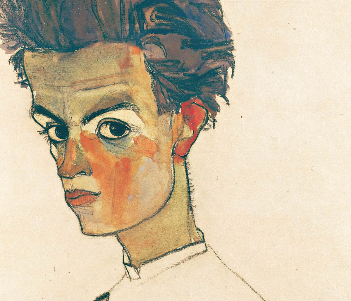Egon Schiele · 1908 · Retrato expressivo em impressão artística com traço essencial e lavagens castanhas quentes