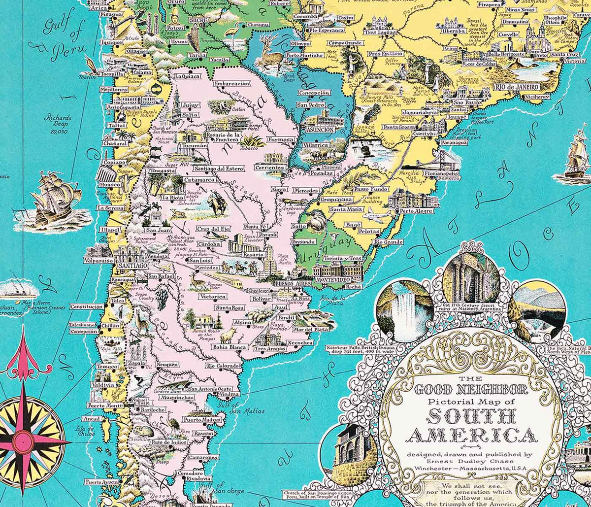 Ernest Dudley Chase · 1935 · Bright illustrated South America map poster with animals, landmarks, and sea routes