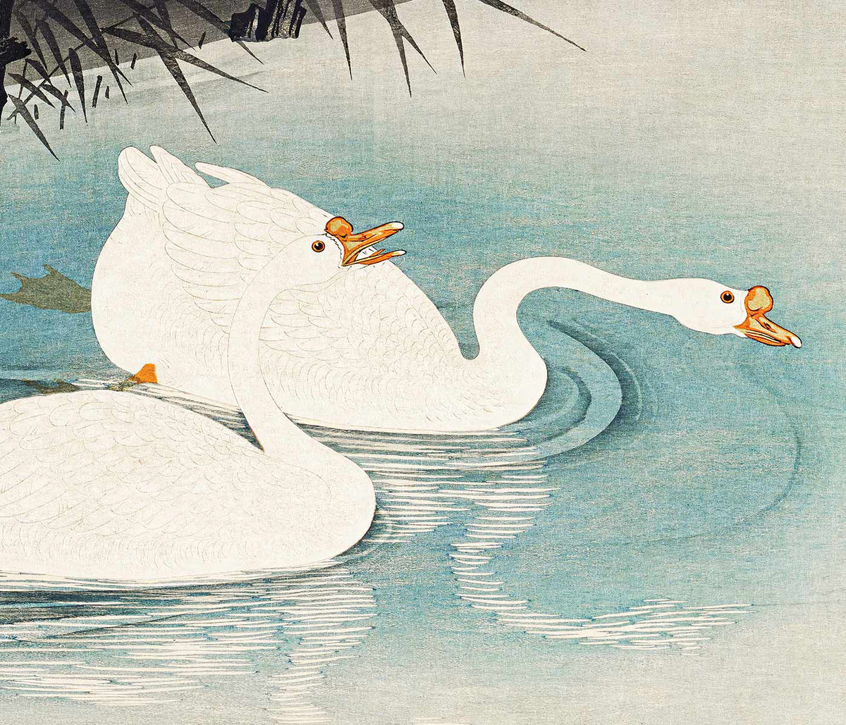 Ohara Koson · 1928 · Serene waterfowl art print of white geese drifting through reeds on blue water
